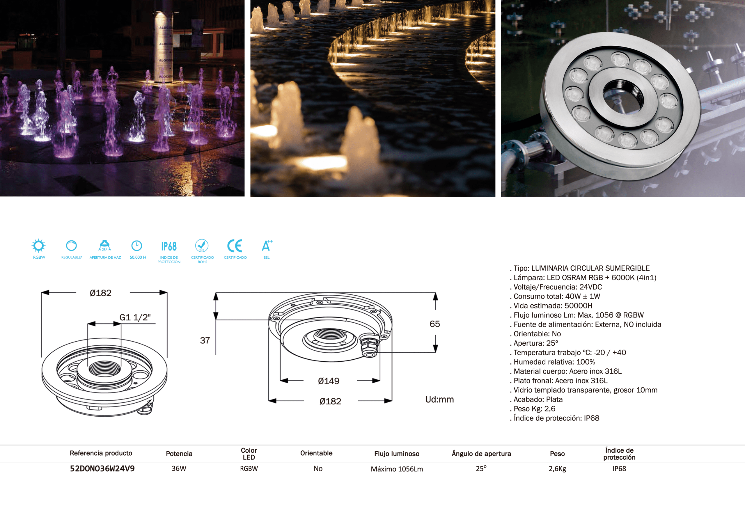 El DONO 36W RGBW es una luminaria circular sumergible, ideal para la iluminación decorativa y funcional en piscinas, fuentes y otros entornos acuáticos. Equipada con tecnología LED OSRAM RGB + 6000K (4 en 1), ofrece una iluminación dinámica con una potencia máxima de 1056 lúmenes. Su diseño robusto, fabricado en acero inoxidable 316L y vidrio templado de 10mm, garantiza durabilidad y resistencia a la corrosión incluso en inmersión continua.