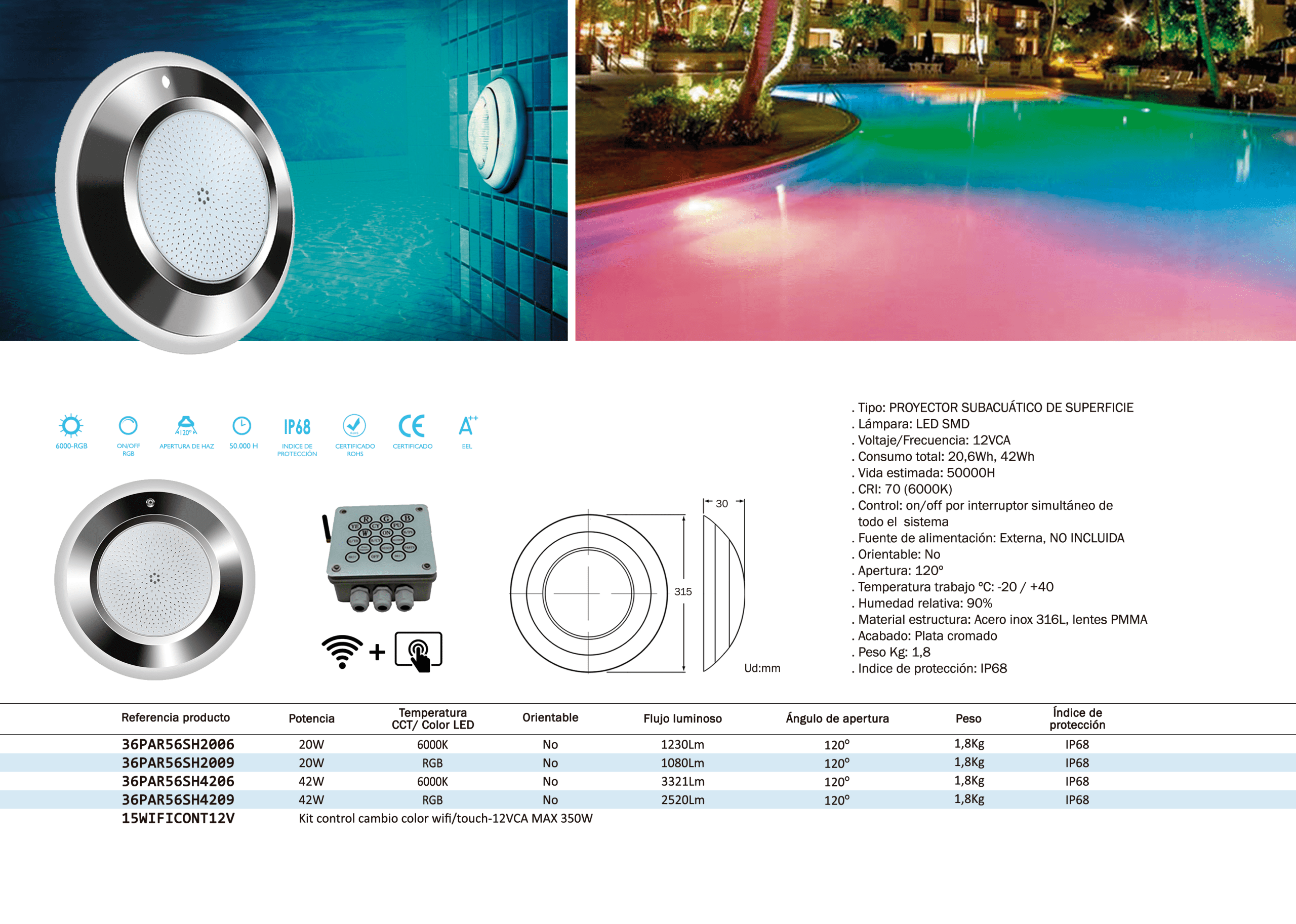 Aplicaciones: Iluminación de piscinas, Fuentes, Estanques, Exteriores